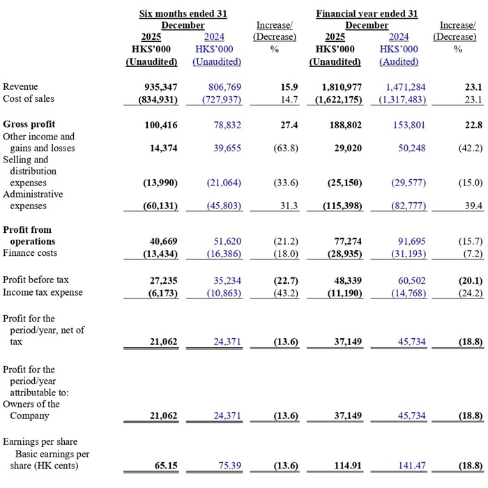 The Group’s overall revenue increased by HK$339.7 million or 23.1%, from HK$1,471.3 million in FY 2024 to HK$1,811.0 million in FY 2025. The increase in revenue was primarily driven by an approximately 27% volume increase in orders from key customers.