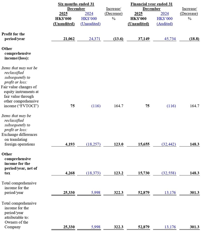 Income tax expense decreased 24.2% or HK$3.6 million, from HK$14.8 million in FY 2024 to HK$11.2 million in FY 2025. This was mainly due to a 20.1% decrease in profit before tax.