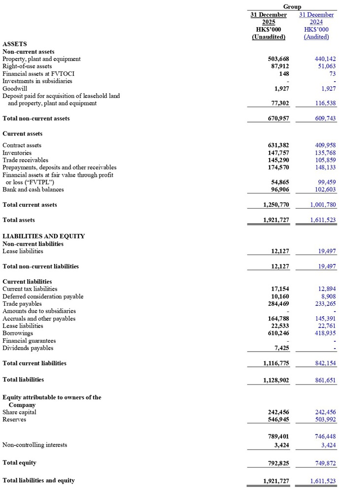 The Group’s non-current liabilities stood at HK$12.1 million as at 31 December 2025, a decrease of HK$7.4 million or 37.9%, from HK$19.5 million as at 31 December 2024, mainly due to decreases in lease liabilities of HK$7.4 million.
